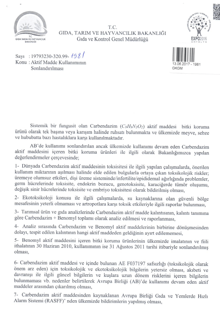Yapılan duyuruda Fransa’da piyasaya arz edilen narlarda güvenli limitlerin üzerinde Spirotetramat, Acetamiprid, Carbendazim, Chlorpyrifos, Pyraclostrobin, Fluxapyroxad ve Deltamethrin maddelerine rastlandığı açıklandı. Diğer yandan açıklanan maddelerden Carbendazim’in yasaklı maddeler arasında olduğu ve Türkiye’de 2018 yılında kullanımının sona erdiği anlaşılıyor. Bakanlık tarafından yapılan yazışma kapsamında söz konusu maddenin toksik riskler içerdiği ve özellikle üremeye olumsuz etkileri, dişi üreme sisteminde problemler, germ hücrelerinde toksisite, endokrin bozucu, genotoksisite, karaciğerde tümör oluşumu, sinir hücrelerinde toksisite ve embriyo toksisitesi gibi önemli hasarlar verebileceği bildiriliyor.