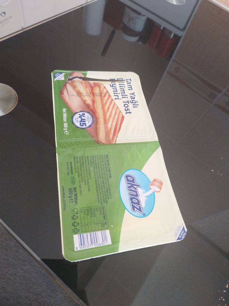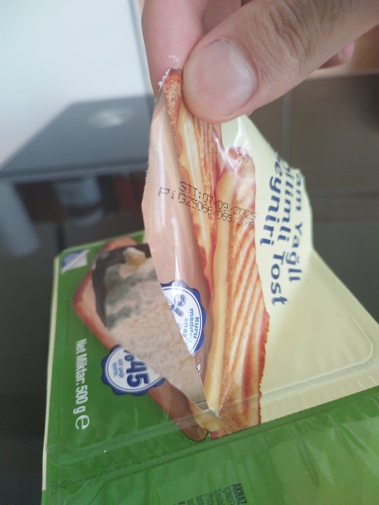 Bim'den dikkat edilmeden alınmış olan Aknaz markalı tost peyniri küflü çıktı. Son tüketim tarihi ise 7 Eylül 2025 görünüyor. Bu ürün nasıl küflü olabiliyor?