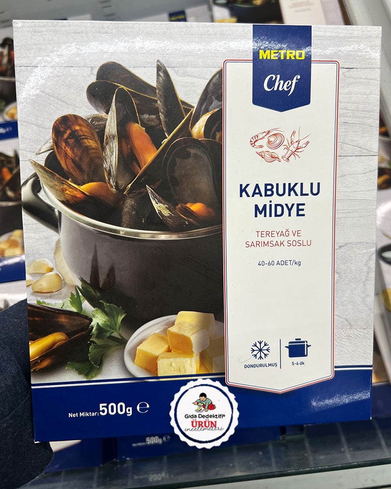 Genellikle lokanta, restoran ya da kafe gibi işletmelerin yoğun olarak alışveriş yaptığı Metro Gross marketlerde satışa sunulan dondurulmuş ürünlerden birini inceleyeceğiz: Metro Chef Tereyağlı ve Sarımsaklı Dondurulmuş Kabuklu Midye. Ürün 500 gr’lık paketlerde satışa sunuluyor ve içeriğinde 40 ila 60 adet kabuklu midye bulunduğu beyan ediliyor. Şili’den ithal edilerek Metro Grossmarket işletmesi için Enlem Soğuk Hava Depolama firması tarafından paketlendiği anlaşılan ürünün hala raflarda olmasına rağmen aslında 6 Aralık 2022 tarihinde üretilerek paketlendiği ve yaklaşık 2 ay sonra tüketim tarihi sona ereceği anlaşılıyor.