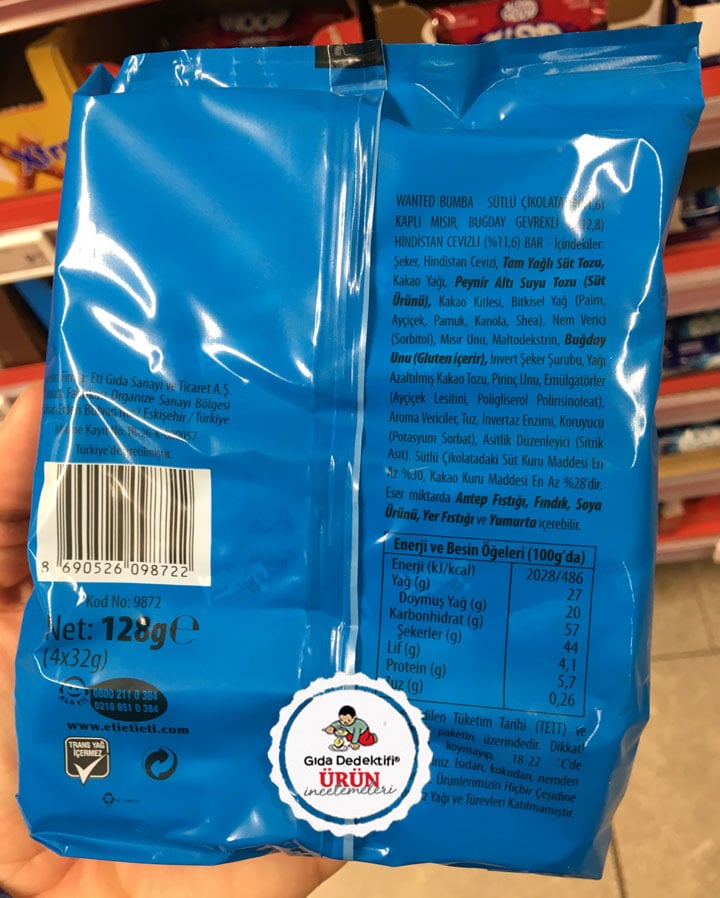 Eti markasıyla yıllardır piyasada yer alan Wanted ürünlerinden 4’lü paketlerde satılan Eti Wanted Bumba Sütlü Çikolata kaplı mısır, buğday gevrekli ve hindistan cevizli bar ürününü inceleyeceğiz. Ürün 128 grl’lık paketlerde satılırken, tek adet ürünün 32 gr. olarak üretildiği görülüyor. Ürün Eti Gıda tarafından Eskişehir’deki tesislerde üretilirken, içeriğinde alkol, domuz yağı ve türevleri bulunmadığı beyan ediliyor.
