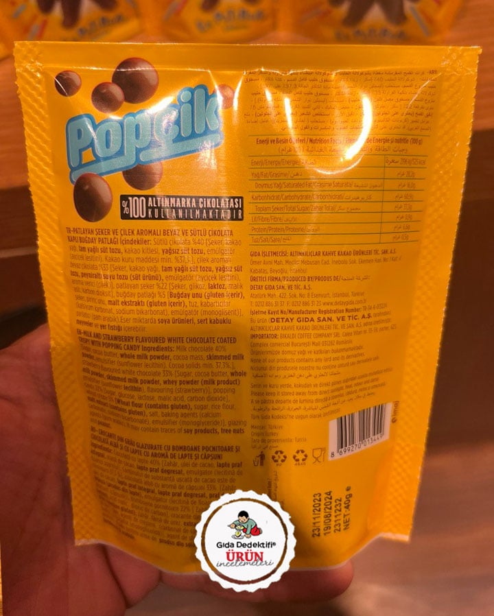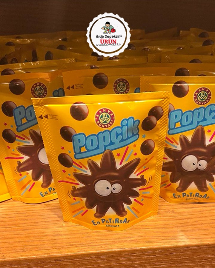 Kahve Dünyası mağazalarında satışa sunulan Popçik markalı patlayan şeker ve çikolata kaplı buğday patlağı ürününü inceleyeceğiz. Ürün 40 gr’lık paketlerde satışa sunuluyor. Ürünün Kahve Dünyası markasıyla bağlantılı şirketlerden Detay Gıda tarafından üretildiği görülüyor.