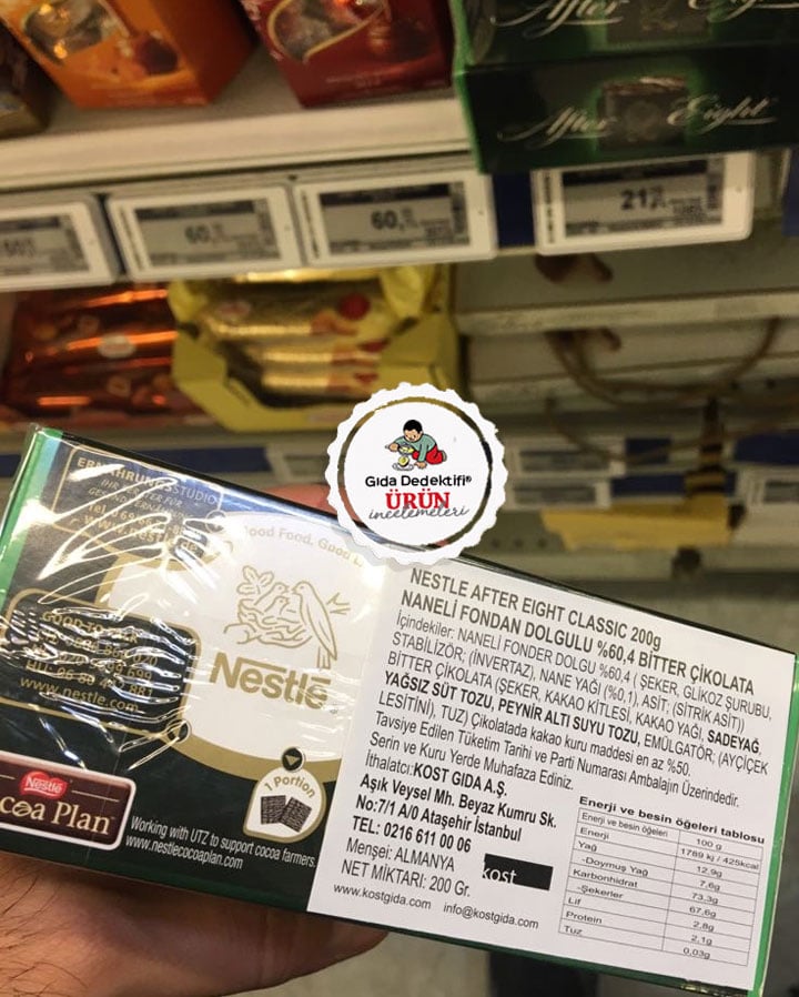 Nestlé tarafından üretilen ve dünyanın birçok ülkesinde satışta olan After Eight Naneli Çikolatayı inceleyeceğiz. Ürün Almanya’dan ithal edilerek ülkemizde 200 gr.’lık paketlerde satılıyor. Ürünün tek adedi yaklaşık 8,3 gr. olup tek pakette 24 adet çikolata bulunmaktadır. Ürünün 2 adedi tek porsiyon olarak kabul edilmektedir. Biz de aşağıdaki besin değerleri tablosunda size iki adetten oluşan tek porsiyonun bilgilerini sunuyoruz.