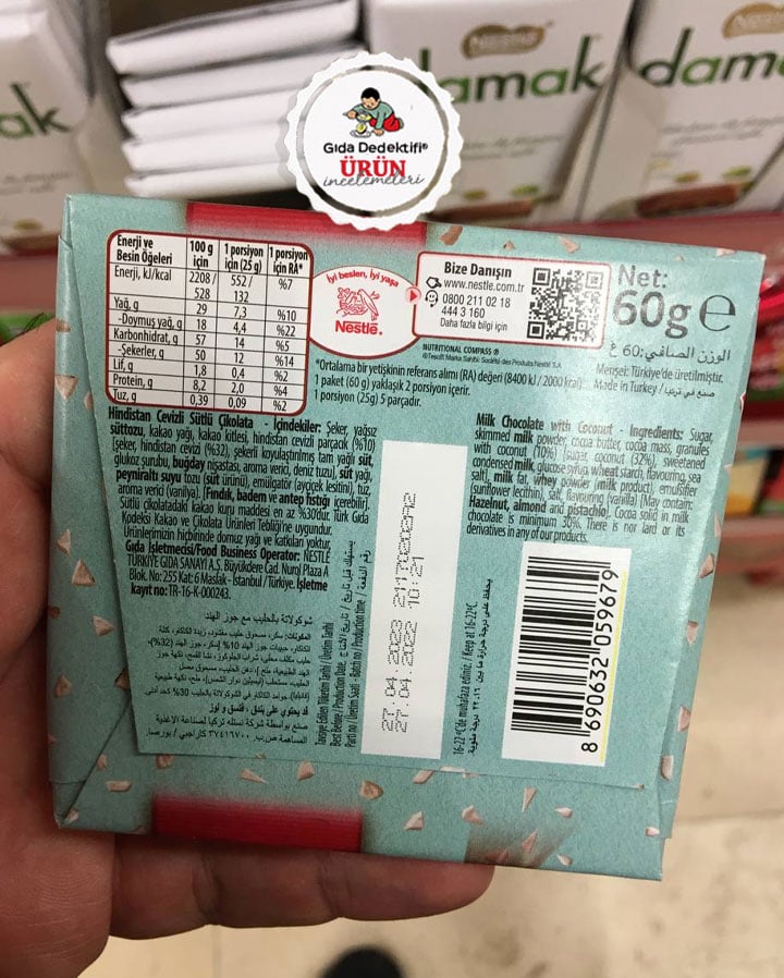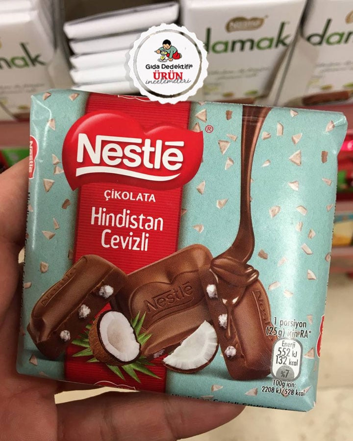 Üzerinde hindistan cevizi görselleriyle donatılmış ambalajıyla satılan bir çikolatayı inceliyoruz; Nestlé Hindistan Cevizli Çikolata. 60 gr.’lık paketlerde satılan üründe Menşe bilgisinde “Türkiye’de üretilmiştir” ifadesi yer alırken ürünün Nestlé’ye ait Bursa Karacabey’deki tesislerde üretildiği anlaşılıyor. Ürün içeriğine baktığımızda ilk bakışta %32 oranında hindistan cevizi ibaresi dikkat çekerken, bunun gerçekte böyle olmadığı anlaşılıyor.