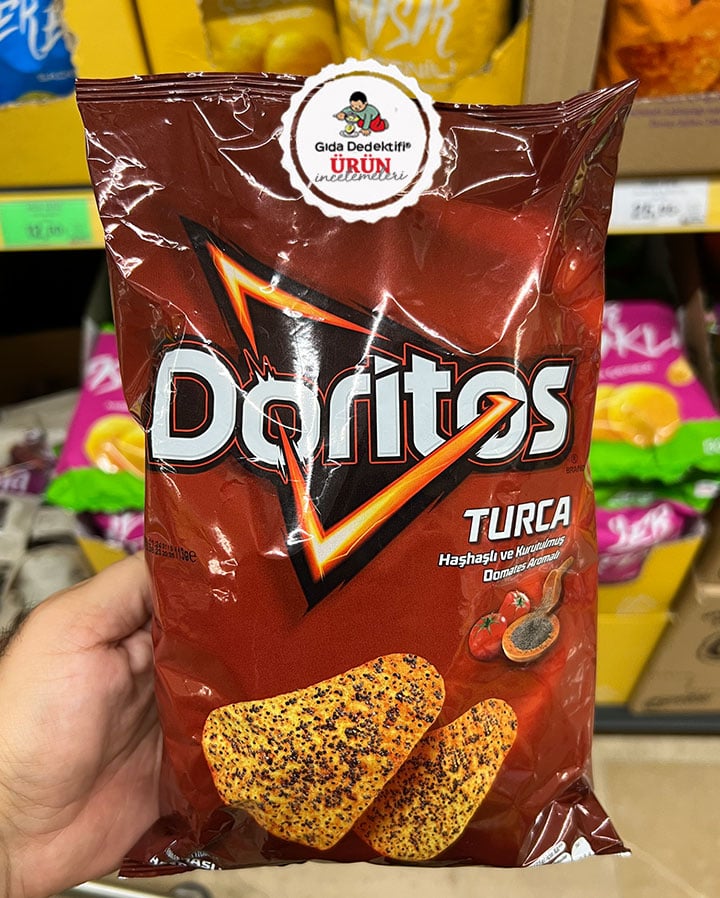 Cem Yılmaz’ın reklam sonrasında uzun süre gündeme oturan ve reklamdaki “bunları insan yiyecek” sloganıyla unutulmazlar arasına giren Doritos Turca Mısır Cipsi’ni inceleyeceğiz. Ürün 113 gr’lık ambalajlarda satışa sunuluyor. Ürünün mevzuata uygun ismiyle haşhaşlı ve kurutulmuş domates aromalı mısır cipsi olarak satıldığını söyleyelim. Diğer yandan ürünün daha önce “domates çeşnili” olarak üretildiğini fakat son dönemlerde aroma vericilerin ilave edilerek “domates aromalı” olarak üretildiğini de vurgulayalım.