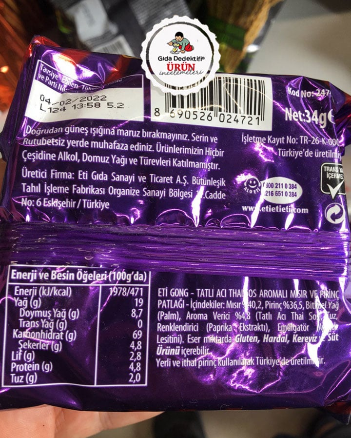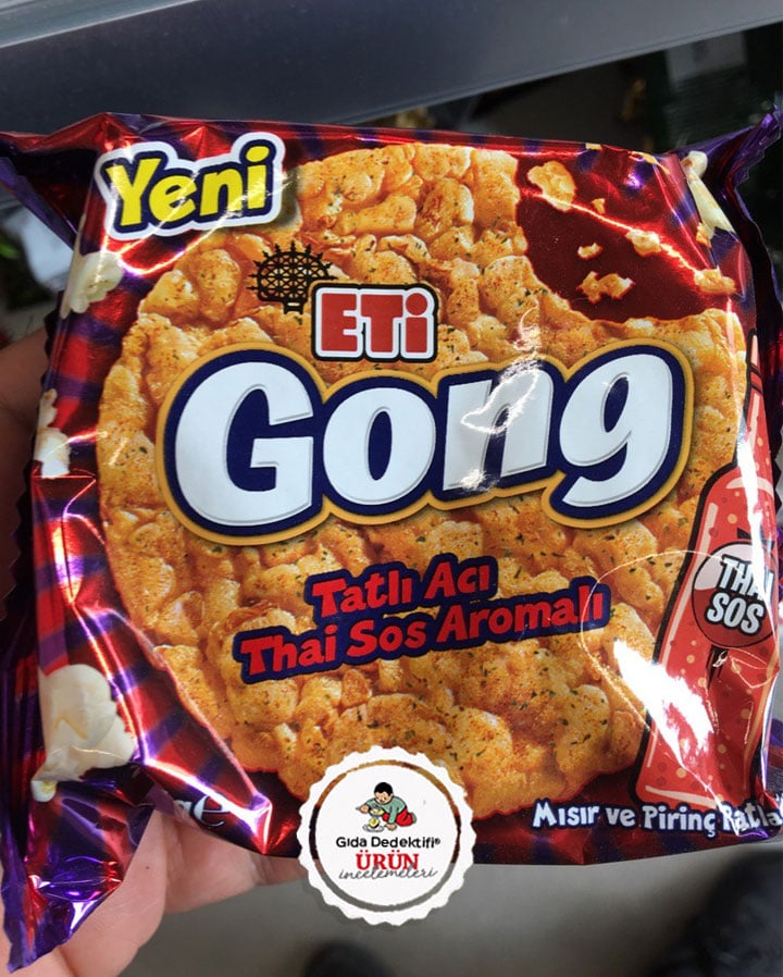 Sizler tarafından sorulan ürünlerden birini Eti Gong markalı mısır ve pirinç patlağını yeni piyasaya çıkan Tatlı Acı Thai Sos aromalı çeşidi üzerinden inceleyeceğiz. Ürün 34 gr.’lık paketlerde satılıyor.