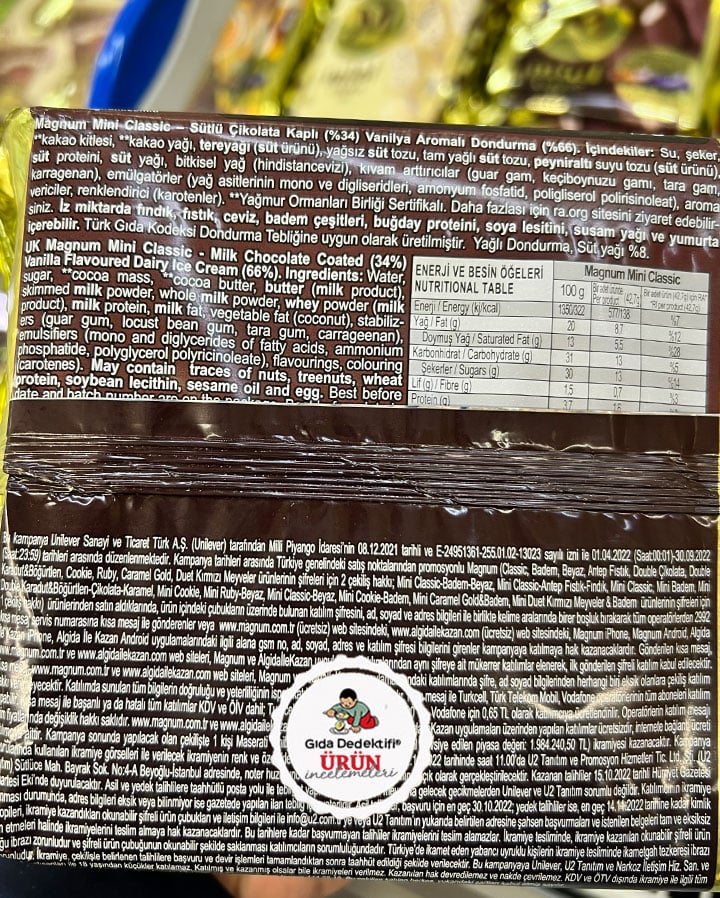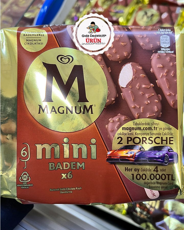 Çok uzun yıllardır çekilişle dağıttığı lüks araçlar ve havalı reklamlarıyla bilinen ve ülkemizde Unilever’e bağlı Algida markasıyla üretilen Magnum Mini Badem ürününü inceleyeceğiz. Ürün 6’lı paketlerde satışa sunuluyor ve pakette 43,2 gr’lık 6 adet çubuk dondurma yer alıyor. Ürünün ambalajında “kavrulmuş bademlerle” ve “magnum çikolatası” ibareleri yer alıyor. Aynı ibare yurtdışındaki ürünlerde “Californian almonds” yani “Kaliforniya Bademleri” ibaresiyle satılıyor. Türkiye’de üretilerek satılan üründeki bademlerin menşe ülkesi ise beyan edilmiyor.