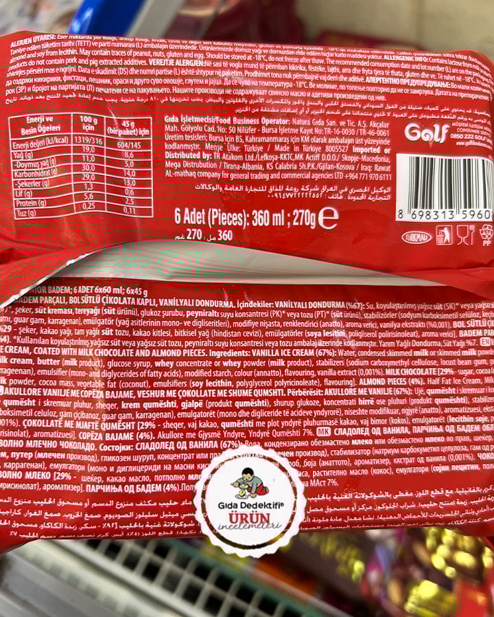 🔎İçindekiler: Vanilyalı dondurma (%67) [Su, Koyulaştırılmış yağsız süt veya yağsız süt tozu, Şeker, Süt kreması, Tereyağı, Glikoz şurubu, Peynir altı suyu konsantresi veya tozu, Stabilizörler (Sodyum karboksimetil selüloz, Keçiboynuzu gamı, Guar gam, Karragenan), Emülgatör (Yağ asitlerinin mono ve digliseritleri), Modifiye nişasta, Renklendirici (Anatto), Aroma verici, Vanilya ekstraktı (%0,001)], Bol sütlü çikolata (%29) [Şeker, Kakao yağı, Tam yağlı süt tozu, Kakao kitlesi, Bitkisel yağ (Hindistan cevizi), Emülgatörler (Soya lesitini, Poligliserol polirisinoleat), Aroma verici], Badem parçaları (%4)