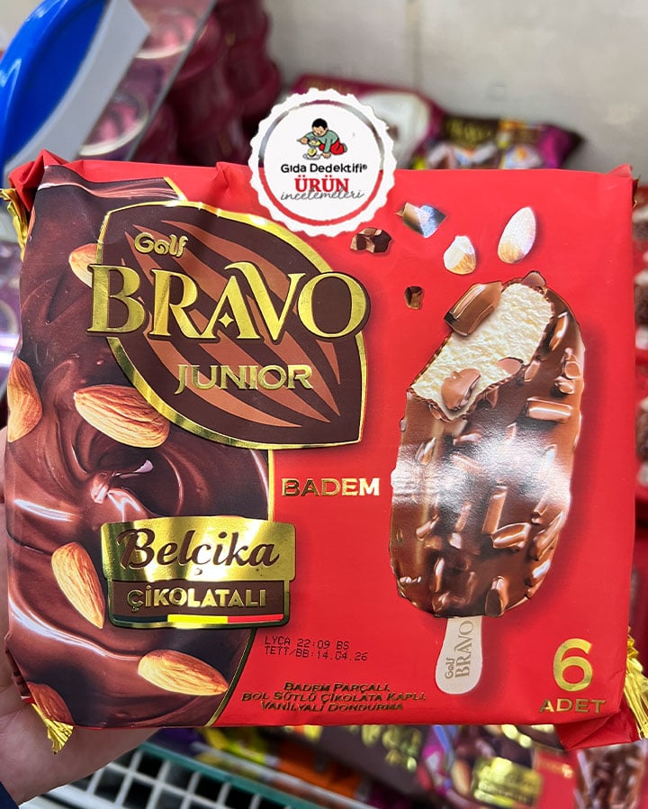 Dün akşam incelemesini yaptığımız Magnum markalı bademli çikolata kaplı dondurmadan sonra bu akşam da benzer şekilde üretilmiş Golf Bravo Junior Belçika Çikolatalı Vanilyalı Dondurma ürününü inceleyeceğiz. Ürün 6’lı paketlerde satılıyor ve tek adedi 45 gr’lık 6 adet çubuk dondurma içeriyor. Ürün temel olarak %67 oranında vanilyalı dondurma, %29 oranında bol sütlü çikolata ve %4 oranında badem parçaları içeriyor. Ürün Natura Gıda tarafından Bursa veya Kahramanmaraş’taki tesislerde üretiliyor.