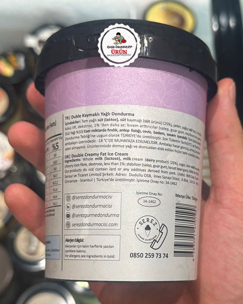 Yaz geride kaldı fakat market reyonlarında gerçekten süt kaymağı içeren dondurma ürünlerini bulmak hala mümkün. Bugün bu ürünlerinden birini inceleyeceğiz: Serez Gurme Duble Kaymaklı Dondurma. Serez Dondurma tarafından İstanbul’daki tesislerinde üretilerek İstanbul'daki şubelerinin yanı sıra, tüm Macrocenter mağazalarında 355 gr’lık paketlerde satışa sunulan Duble Kaymaklı tam yağlı dondurma içeriğinde bitkisel yağ veya glikoz-fruktoz şurubu bulunmuyor.