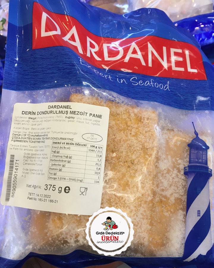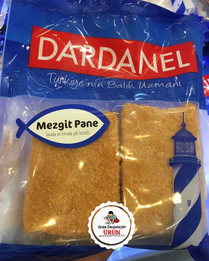 Uzun yıllardır ton balığı üretimiyle bilinen Dardanel tarafından farklı çeşitlerde balıklar marketlerin dondurucu raflarında yer almaya başladı. Bunlardan birini, Dardanel markalı Mezgit Pane ürününü inceleyeceğiz. Ürün 350 gr.’lık dondurulmuş paketlerde, tek pakette 5 dilim olarak satılıyor. Buna göre tek dilim ürün 75 gr. olarak hesaplanıyor. Ürün içeriğinde %60 oranında Pollechius Virens türü ithal Mezgit bulunuyor. Fakat “pane” olarak satılan üründe tabii ki mezgit tek başına bulunmuyor.