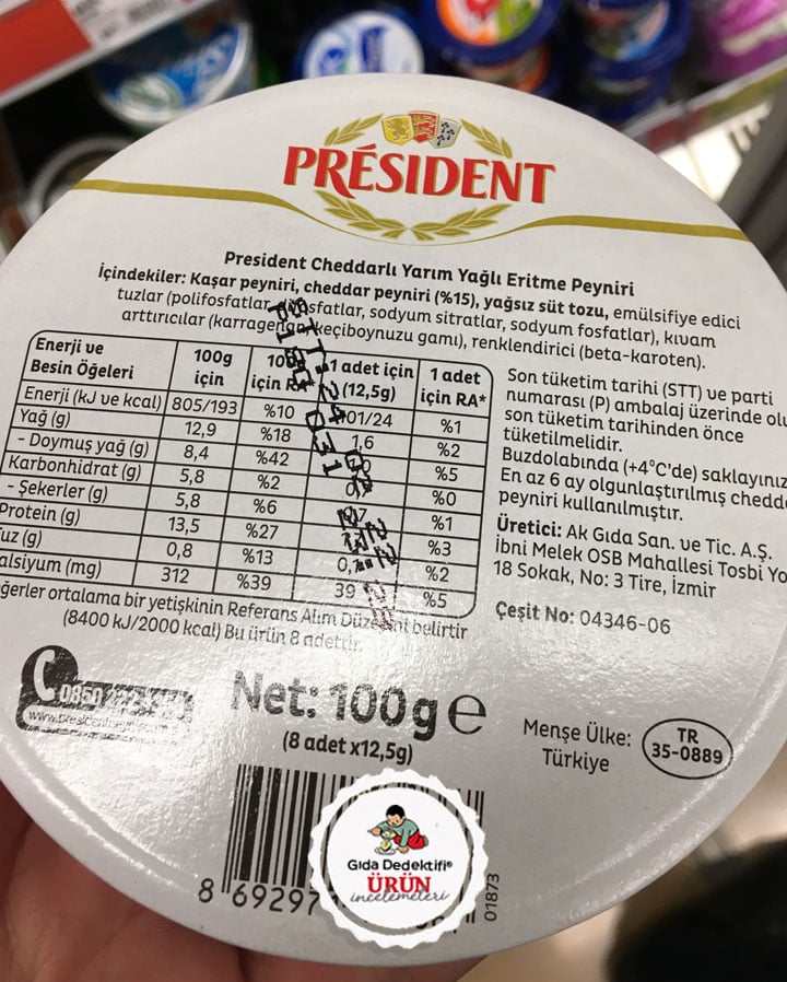 Son yıllarda raflarda görmeye başladığımız ve Fransız Lactalis’in Ak Gıda’yı satın alması sonrasında Türkiye’ye getirdiği President markalı bir peyniri inceleyeceğiz; President Cheddarlı Üçgen Peynir. Ürün aslında yarım yağlı eritme peyniri kategorisinde olup içeriğinde çeşitli katkı maddeleri bulunmaktadır. Ürün 100 gr.’lık paketlerde, 12,5 gr.’lık 8 adet üçgen peynir olarak satılmaktadır. Ürünün Ak Gıda’nın İzmir’deki tesislerde üretildiğini ve bunun da etikette açıkça beyan edildiğini belirtelim.