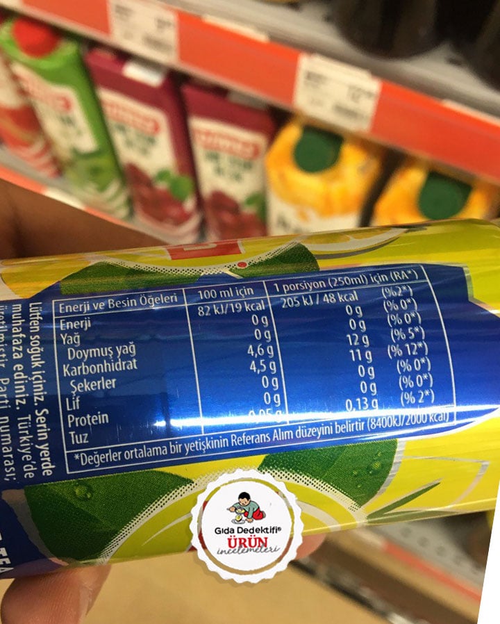 🔎İçindekiler: Su, Şeker, Fruktoz, Sitrik asit, Siyah çay ekstraktı (%0,12), Limon suyu konsantresi (%0,1), Asitlik Düzenleyici (Trisodyum Sitrat), Aroma verici (Limon), Antioksidan (Askorbik asit), Tatlandırıcı (Steviol Glikozitler)