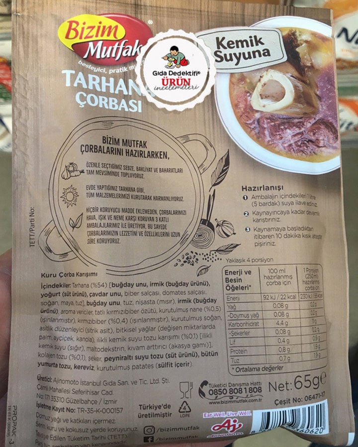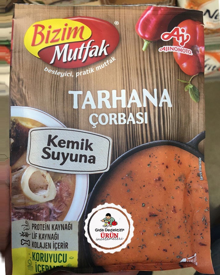 Artık raflarda birçok farklı çeşidini görmeye başladığımız hazır çorbalarda son dönemlerde “kemik suyu”, “kolajen” içerdiğine dair ibareler dikkat çekiyor. Ürünlerde ayrıca “koruyucu” içermediğine dair beyanlar ürünün içeriğinin detaylarıyla açıklanması gereğini doğuruyor. Bu haliyle bugün Bizim Mutfak Tarhana Çorbasını inceleyeceğiz. Ürün 65 gr.’lık paketlerde satılıyor ve Ajinomoto İstanbul Gıda tarafından Türkiye’de üretiliyor.