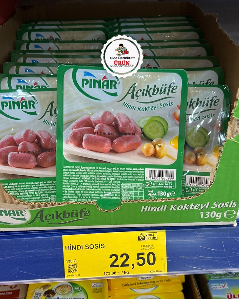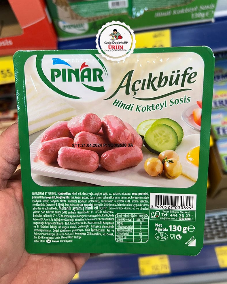 Pınar markasıyla satışa sunulan Açıkbüfe Hindi Kokteyl Sosis ürününü inceleyeceğiz. İzmir’deki Pınar Entegre Et tesislerinde üretildiği anlaşılan ürün130 gr’lık paketlerde satışa sunuluyor. Ürün ambalajında “doğal tütsüleme yapılmıştır” ve “mekanik ayrılmış hindi eti içerir” ifadeleri dikkat çekiyor. Mekanik ayrılmış hindi eti, elle büyük parçalar ayrıldıktan sonra kemikte kalan etin mekanik yolla ayrıldığını gösteren bir tabirdir. Mekanik olarak ayrılan etle, elle ayrılan etin kimyasal bileşimi farklı olmaktadır. Bilimsel araştırmalara göre, mekanik ayrılmış etlerde daha fazla kemik iliği, ufalanmış kemik ve daha az bağ dokusu bulunuyor. Bu haliyle mekanik olarak ayrılan etin yağ oranı ele ayrılan ete göre daha fazla olup, protein oranı ise daha az olmaktadır.