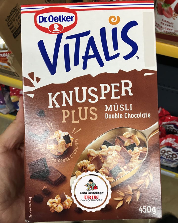 Artık süpermarket raflarında çok sayıda kahvaltılık gevrek ve müsli ürünlerine rastlıyoruz. Sizlerle market raflarında rastladığımız ve Almanya’dan ithal edilerek ülkemizde satışa sunulan Dr. Oetker Vitalis markalı Knusper Plus Sütlü ve Bitter Çikolatalı Müsli ürününü inceleyeceğiz. Ürün 450 gr.’lık paketlerde satılıyor. Etiketteki tarifine göre ürünün tek porsiyonu; 40 gr. müsli ile 60 ml. yarım yağlı süt ile hazırlanıyor. Ürün ambalajında ayrıca “%47 tam tane yulaf ezmesi”, “Büyük çıtır parçalar”, “Bitter ve sütlü çikolata parçaları” gibi ifadeler yer alıyor.