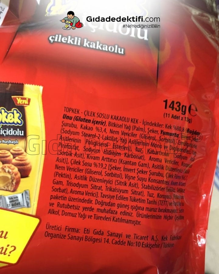 🔍İçindekiler: Kek (%80,8) [Buğday unu, Bitkisel yağ (Palm), Şeker, Yumurta, İnvert şeker şurubu, Kakao (%3,4), Nem vericiler (Gliserol, Sorbitol), Emülgatörler (Sodyum Stearol-2-Laktitat, Yağ asitlerinin mono ve digliseritleri, Yağ asitlerinin poligliserol esterleri), Tuz, Kabartıcılar (Sodyum Asit Pirofosfat, Sodyum Hidrojen Karbonat), Aroma vericiler, Koruyucu (Sorbik asit), Kıvam arttırıcı (Ksantan gam), Asitlik Düzenleyici (Malik asit)], Çilek sosu (%19,2) [Şeker, İnvert şeker şurubu, Çilek püresi (%8,7), Nem vericiler (Gliserol, Sorbitol), Vişne suyu konsantresi, Kıvam arttırıcı (Pektin), Asitlik Düzenleyici (Sitrik asit), Stabilizörler (Selüloz, Selüloz gam, Trisodyum Sitrat, Trikalsiyum sitrat), Tuz, Koruyucu (Potasyum Sorbat), Aroma verici]