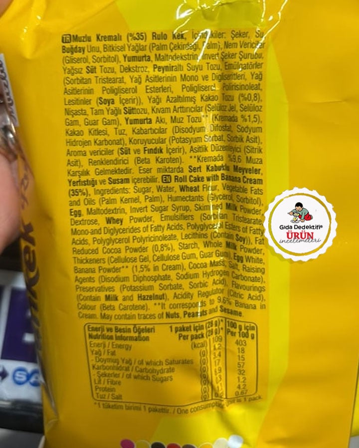 🔍İçindekiler: Şeker, Su, Buğday Unu, Bitkisel Yağlar (Palm Çekirdeği, Palm), Nem Verici [Gliserol, Sorbitol], Yumurta, Maltodekstrin, İnvert Şeker Şurubu, Yağsız Süt Tozu, Dekstroz, Peyniraltı Suyu Tozu, Emülgatörler [Sorbitan Tristearat, Yağ Asitlerinin Mono ve Digliseritleri, Yağ Asitlerinin Poligliserol Esterleri, Poligliserol Polirinsinoleat, Soya lesitini], Yağı Azaltılmış Kakao Tozu (%0,8), Nişasta, Tam Yağlı Süttozu, Kıvam Arttırıcılar [Selüloz, Selüloz Gam, Guar Gam], Yumurta Akı, Muz Tozu (%1,5), Kakao Kitlesi, Tuz, Kabartıcılar [Disodyum Difosfat, Sodyum Hidrojen Karbonat], Koruyucular [Potasyum Sorbat, Sorbik Asit], Aroma vericiler, Asitlik Düzenleyici [Sitrik Asit], Renklendirici [Beta Karoten]