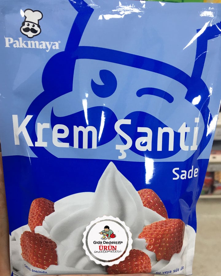 Evlerde yapılan pastalarda ve tatlılarda kullanılmak üzere market reyonlarından alınan krem şanti ürünlerinden birini inceleyeceğiz: Pakmaya Sade Krem Şanti. Ürün 75 gr.’lık paketlerde toz karışım olarak satılıyor. Ürünün kullanım önerileri olarak “Pasta, kek, turta, sütlü tatlı ve meyve salatalarının hazırlanmasında ve dekorasyonunda kullanabilirsiniz” ifadesi dikkat çekiyor. Ürün 200 ml. su ile hazırlanıyor. Ürün içeriğinde şeker ve glikoz şurubu haricinde birçok katkı maddesi bulunuyor. Ürün ambalajında Türkiye’de üretilmiştir ibaresi yer alıyor.
