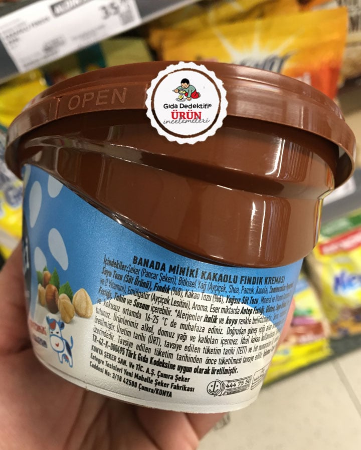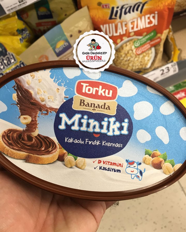 Torku tarafından Nutella ve benzeri kakao fındık kremalarına rakip olarak çıkarılan fakat içeriğindeki palm yağını uzun süre hurma yağı diye tüketiciye sunarak piyasada kendine yer edinmeyi başaran Banada markasıyla piyasaya çıkan çocuklara yönelik çeşidi inceliyoruz; Torku Banada Miniki Kakaolu Fındık Kreması. Ürün cam kavanozlar yerine 450 gr.’lık plastik kutularda tüketiciye sunuluyor. Ürün üzerinde fındık görselleri ile “D vitamini” ve “Kalsiyum” ibareleri dikkat çekiyor.