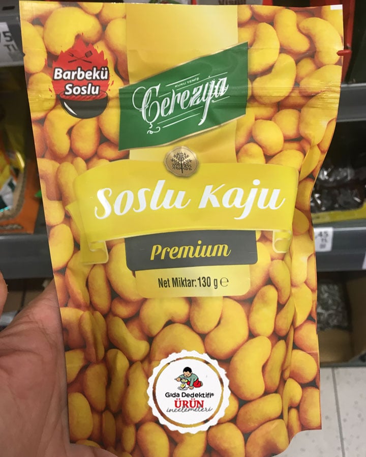 A101 marketlerinde kuruyemiş raflarında satılan ve dikkatimizi çeken bir ürünü inceleyeceğiz: Çerezya Preium Barbekü Soslu Kaju. Ürün 130 gr.’lık paketlerde satılıyor ve ürünün etiket bilgileri üzerinden A101 firması tarafından Malatya Pazarı firmasına fason olarak ürettirildiği anlaşılıyor. Ürün ambalajında “barbekü soslu” ifadesi dikkat çekiyor. Ürünün sıradan kaju fıstığından farklı olarak katkı maddeleri içeren bir çeşit olduğu anlaşılıyor.