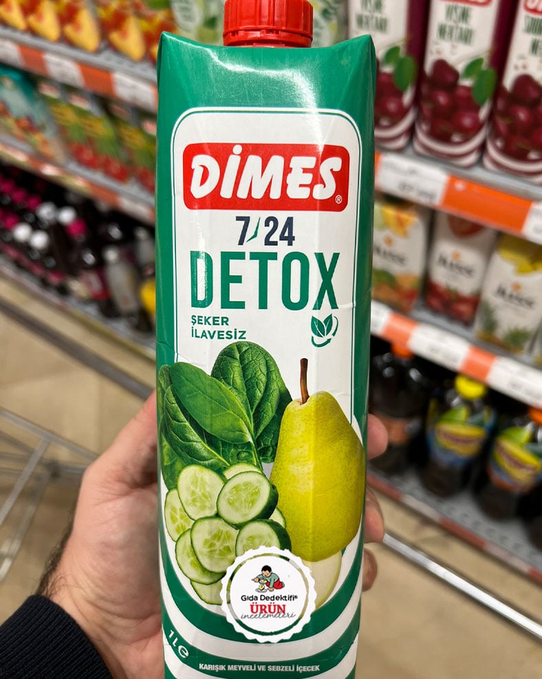 Marketlerin meyve suyu reyonlarında ismiyle dikkat çeken bir ürünü inceleyeceğiz: Dimes 7/24 Detoks. 1 litrelik paketlerde satışa sunulan ürün ambalajında salatalık, ıspanak, armut ve elma görselleri yer alıyor. Ürün “detoks” gibi iddialı bir isimle satılsa da, yasal ismiyle aslında karışık meyveli ve sebzeli içecek olarak tanımlanıyor. Ürün ambalajında ayrıca “şeker ilavesiz” ifadesi yer alıyor.