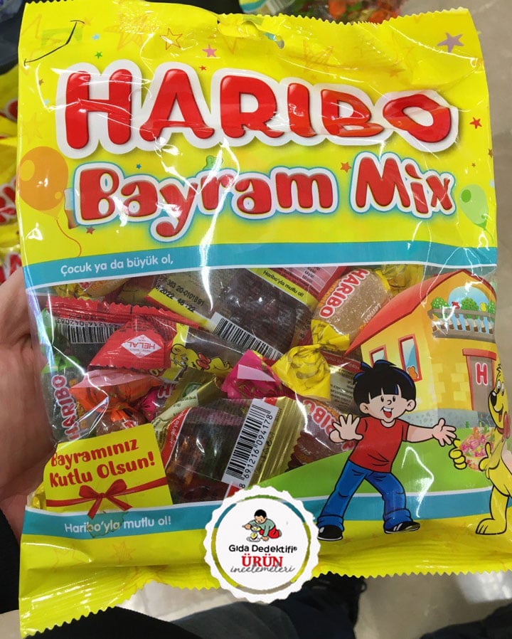 Normalde market raflarında gördüğümüz ve Party Mix ismiyle bilinen Haribo markalı şekerlemelerin bayram temasıyla dönüştürülen Bayram Mix ürününü inceleyeceğiz. Ürün içeriğinde geçen bayramda incelediğimiz Fruitbon isimli yumuşak şekerlemeler haricinde Haribo’nun standart “altın ayıcık” ismiyle bilinen şekerlemeleri ile Happy Cola isimli yumuşak şekerlemeleri yer alıyor. Toplamda 250 gr.’lık ürün ambalajından çeşitli aromalara sahip fruitbons tek tek paketlenmiş olarak, Happy Cola ve Goldbears ise 10 gr.’lık paketlerde çıkıyor. Bugün sizlerle bu paketten çıkan Haribo Happy Cola çeşidini inceleyeceğiz.