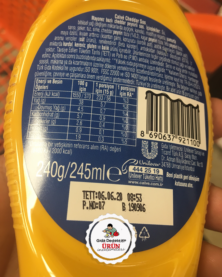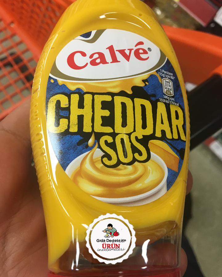 Birkaç gündür konuşulan mayonez ürünlerine farklı bir çeşitle bakacağız; Calvé Cheddar sos. Ürün 240 gr.’lık ambalajlarda ön yüzünde Cheddar peyniri görselleriyle satılmaktadır. Üründe %0,2 yani binde 2 oranında Cheddar peyniri tozu bulunmaktadır. Bu da 240 gr.’lık tek ambalajda sadece 0,48 gr. peynir demektir. Yani 1 gramın yarısından bile az miktardaki bir toz bulunduğu için bu üründe cheddar peyniri görselleri yer almakta, ürün “Cheddar sos” olarak isimlendirilmektedir. Ürünün yasal adı da “Cheddar peynirli Mayonez bazlı sos” olarak geçmektedir. Üründe %0,2 yani binde 2 oranından daha az oranda Kaşar peyniri ve feta peyniri tozu da bulunmaktadır. Bu haliyle üründe Cheddar peynirinden daha yüksek oranda Şeker ve tuz bulunduğundan ürüne Şekerli ve tuzlu Cheddar peynirli sos da diyebiliriz.