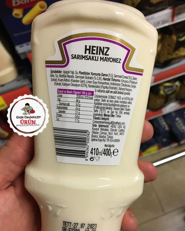 Ketçap ve mayonez haricinde market raflarında birçok farklı sos ürünlerine de rastlıyoruz. Bunlardan birini; Heinz Sarımsaklı Mayonez ürününü inceleyeceğiz. Ürün Heinz Gıda A.Ş. tarafından KHC Turkey Gıda San. A.Ş. firmasına ait Bursa’daki üretim tesislerinde üretiliyor. KHS Turkey Gıda firması da Kraft Heinz’ın sahip olduğu şirketlerden biri olarak dikkat çekiyor. Ambalajında sarımsak görselleri yer alan ürün 400 gr.’lık paketlerde satılıyor.