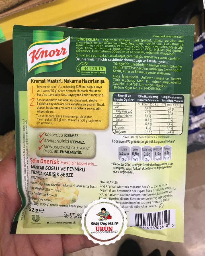 Buna göre 375 ml suyla hazırlanmış haliyle ürün tek paketinde 255 kcal enerji veriyor. Ürünün tek paketiyle hazırlanan sosta 15,8 gr yağ bulunurken, palm yağının etkisiyle bu yağın 8,9 gramı doymuş yağdan ibarettir. Buna göre üründen alınan kalorinin %31,5’i doymuş yağdan gelmektedir. Tek paket ürünle hazırlanan sosta ayrıca 2,2 gr şeker yer alırken, 4,7 gr protein ve 1,6 gr tuz bulunduğu beyan edilmektedir. #NeYediğiniziBilin