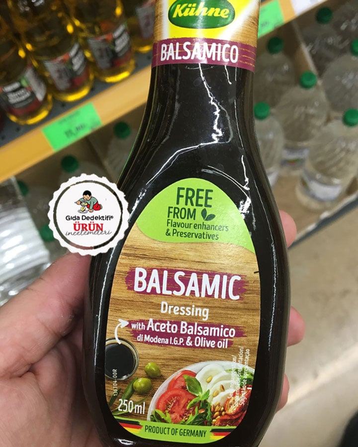İthal edilerek ülkemizde satışa sunulan salata soslarından Balsamik Sirke içeren Kühne Balsamic Dressing Salata sosu ürününü inceleyeceğiz. Ürün 250 ml’lik cam şişelerde satışa sunuluyor. Ürünün Carl Kühne Fermentasyon ve Gıda San. ve Tic. A.Ş. firması tarafından Almanya’dan ithal edilerek Türkiye’de satışa sunulduğu anlaşılıyor. Ürün içeriğinde %25 oranında Balsamik sirke yer alırken, sirkenin İtalya’nın Modena eyaletinde üretilen özel bir sirke olduğu ve sirkenin menşe korumasına sahip olduğu belirtiliyor. Üründe ayrıca zeytinyağı ilavesi olduğu ambalajın ön yüzünde de beyan ediliyor.