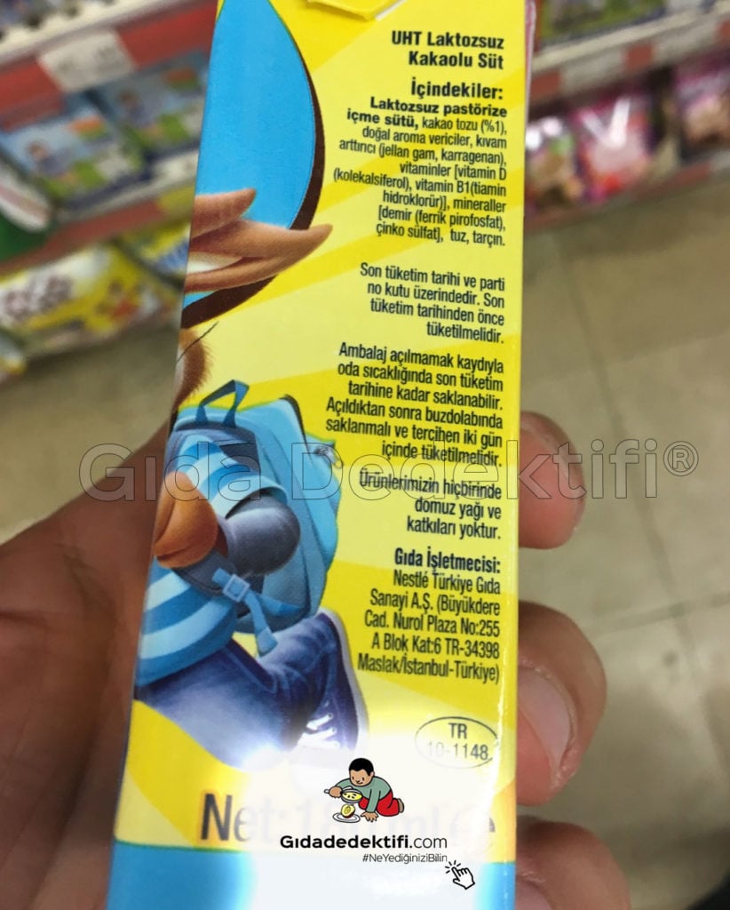 🔎İçindekiler; Laktozsuz Pastörize İçme sütü, Kakao tozu (%1), Doğal aroma vericiler, Kıvam arttırıcı (Jellan gam, Karragenan), Vitaminler (D vitamini, B1 vitamini), Mineraller (Demir, Çinko Sülfat), Tuz, Tarçın