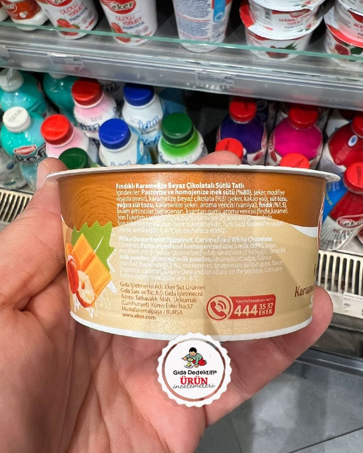 🔍İçindekiler: Pastörize ve homojenize inek sütü (%80), Şeker, Modifiye nişasta (mısır), Karamelize beyaz çikolata (%3) [Şeker, Kakao yağı, Süt tozu, Yağsız süttozu, Karamelize şeker, Aroma verici (Vanilya)], Fındık (%1,5), Kıvam arttırıcılar (Karragenan, Ksantan gam), Aroma verici (Fındık, Karamel)